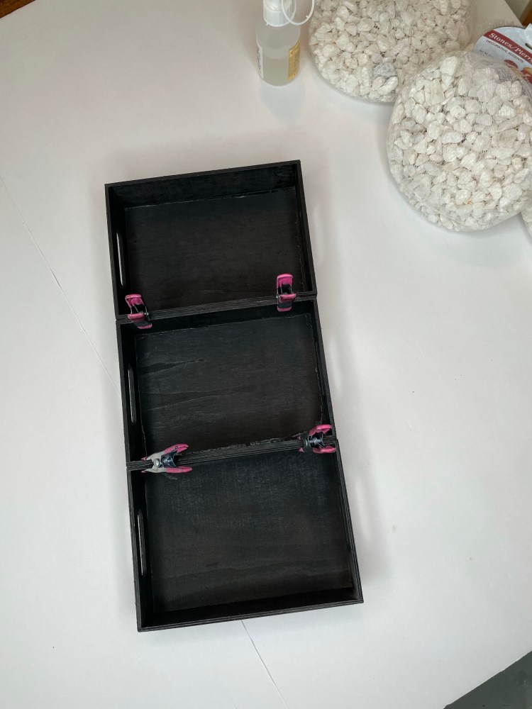 Step 2: After the glue has hardened, remove the clamps and spray paint the top and the bottom of the long tray with spray paint. I used Rustoleum Canyon Black in Satin for a low sheen. Let dry.